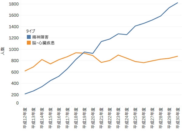 過労による精神障害の発症者が急増しているのがポイントです。