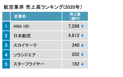 首位はANA HDで売上高7,286億円(前年比63.1%減、1兆2,456億円減)