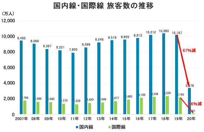 前年比66.9%減の3,376万人、国際線は96.2%減の81万人でした。