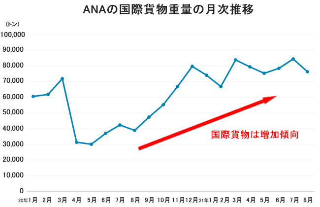 コロナ禍で需要が高まる電子部品や半導体、自動車、医薬品や医療機器などの国際輸送の需要が高まっています。こちらのグラフは航空首位のANAの国際貨物重量の月次推移を示したもので