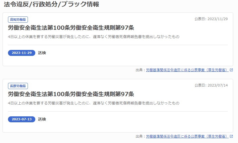 このサイトではブラック企業リストに載っている企業は従業員の口コミや噂話の主観的な情報ではなく、厚生労働省や国交省から法令違反、行政処分を受けた企業情報が掲載されています。
