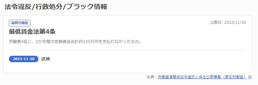 この記事では一応社名を伏せますが実際には違反を受けた企業がこの様に実名で公開されています。この企業の場合は 2023/11/30に公表され、労働者4名に、2か月間の定期賃金合計約120万円を支払わなかったものとして最低賃金法第4条を違反したとして送検をされています。