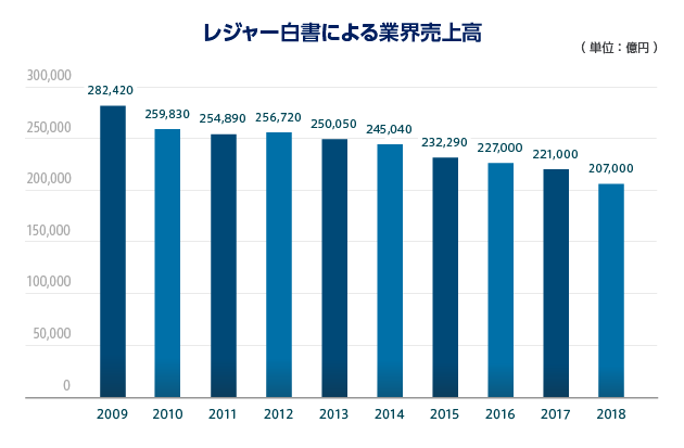2017年度には19兆5400億円と20兆円を割る市場規模にまで縮小をしています。