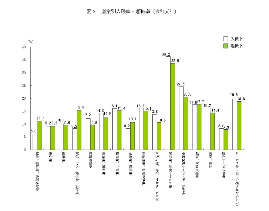そうだね。宿泊業も加算してのグラフになるけど他業界と比べて離職率が高い業界になるよね。