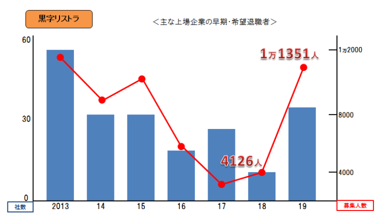 黒字リストラの退職者が2019年に跳ね上がっています。